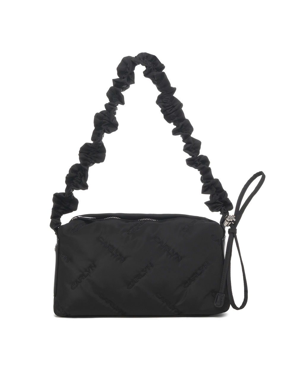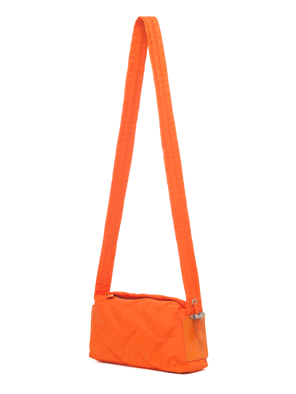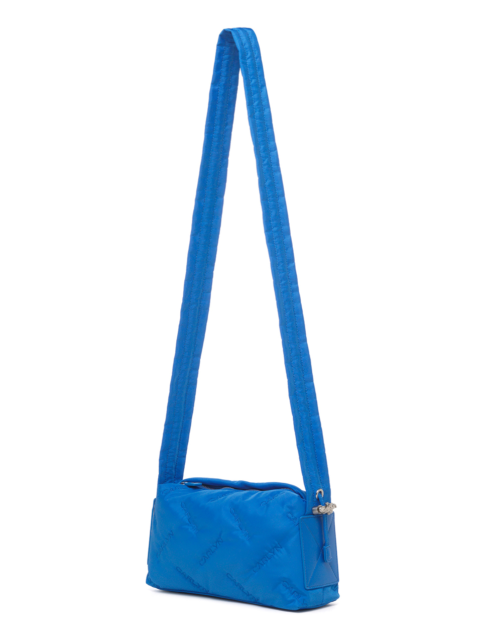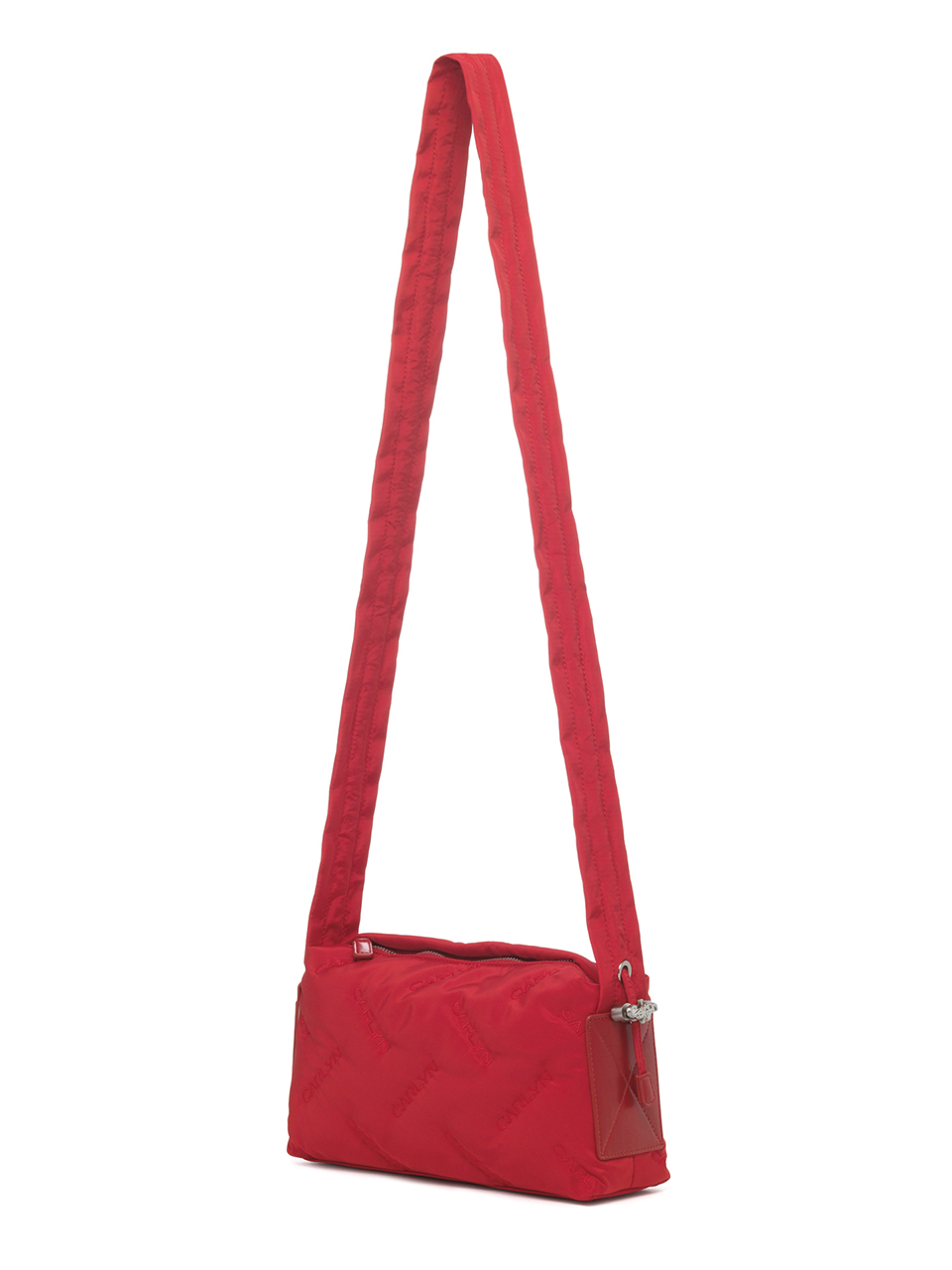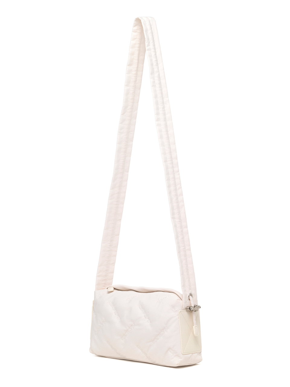 · Square-shaped nylon mini bag with CARLYN logo quilting · Adjustable strap with logo stopper for versatile styling · Lightweight and spacious, with a side PU pocket for card storage