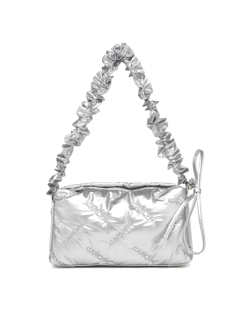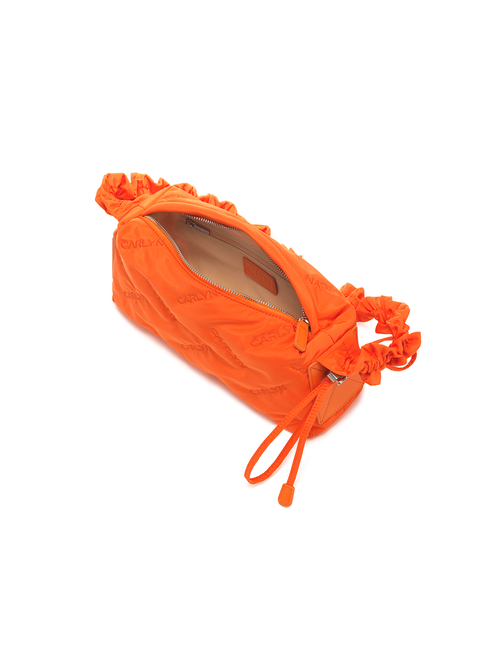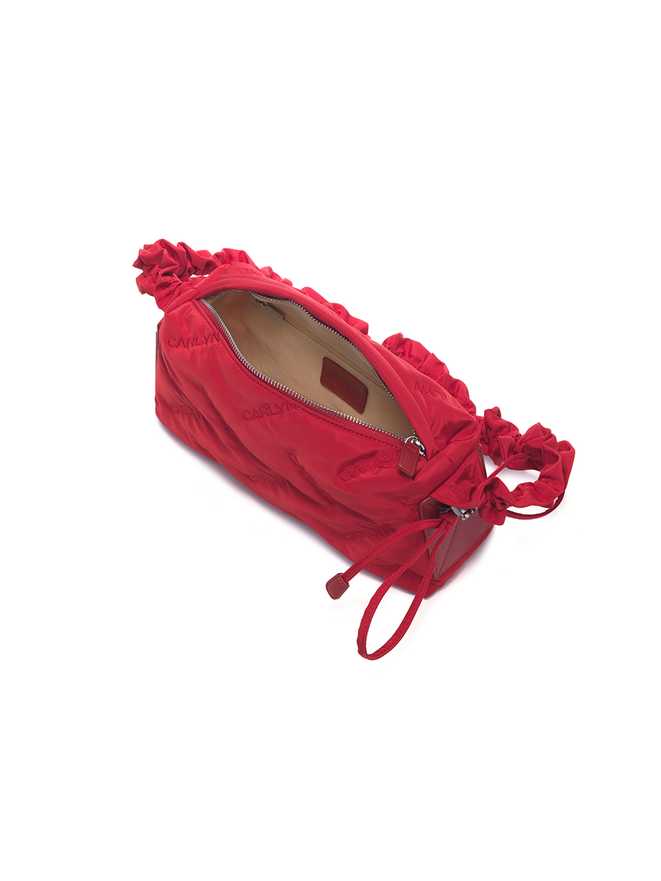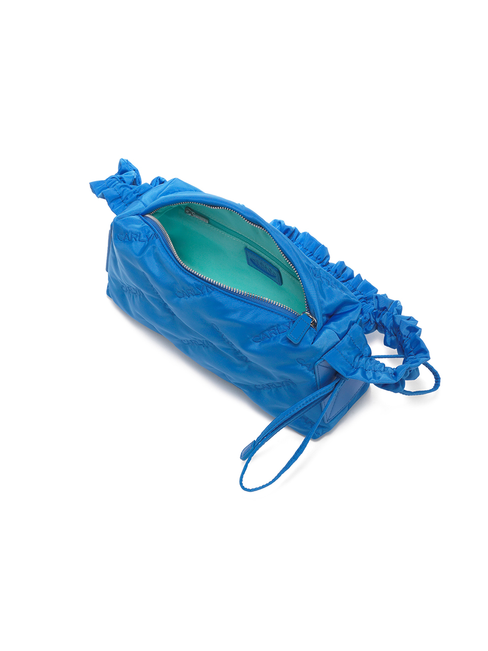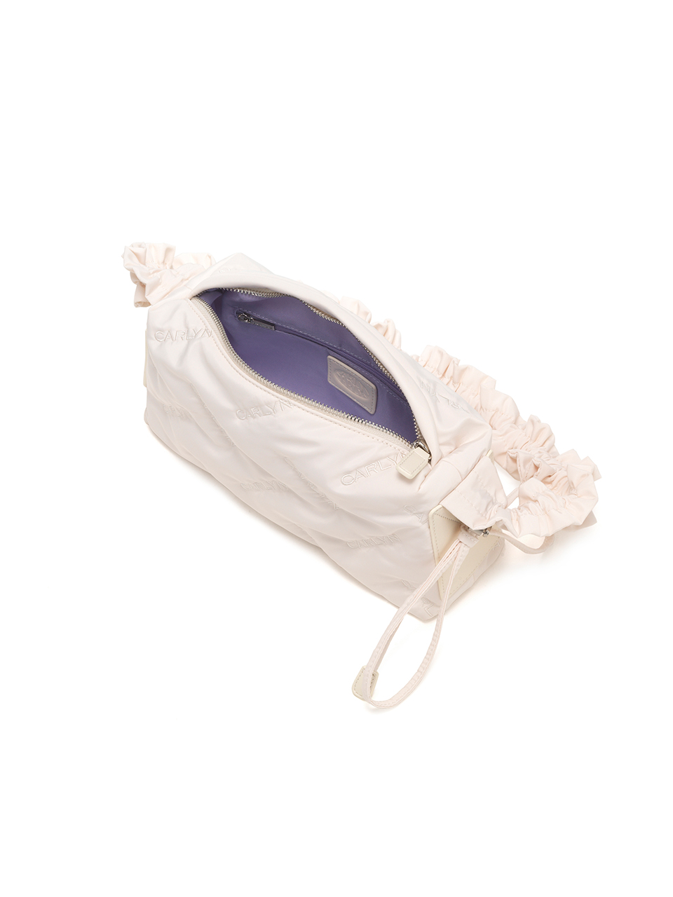 · Square-shaped nylon mini bag with CARLYN logo quilting · Adjustable strap with logo stopper for versatile styling · Lightweight and spacious, with a side PU pocket for card storage