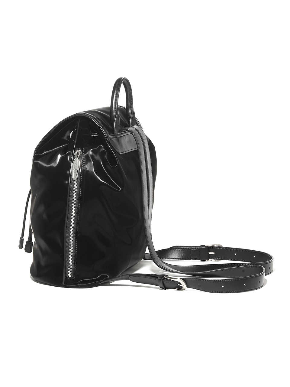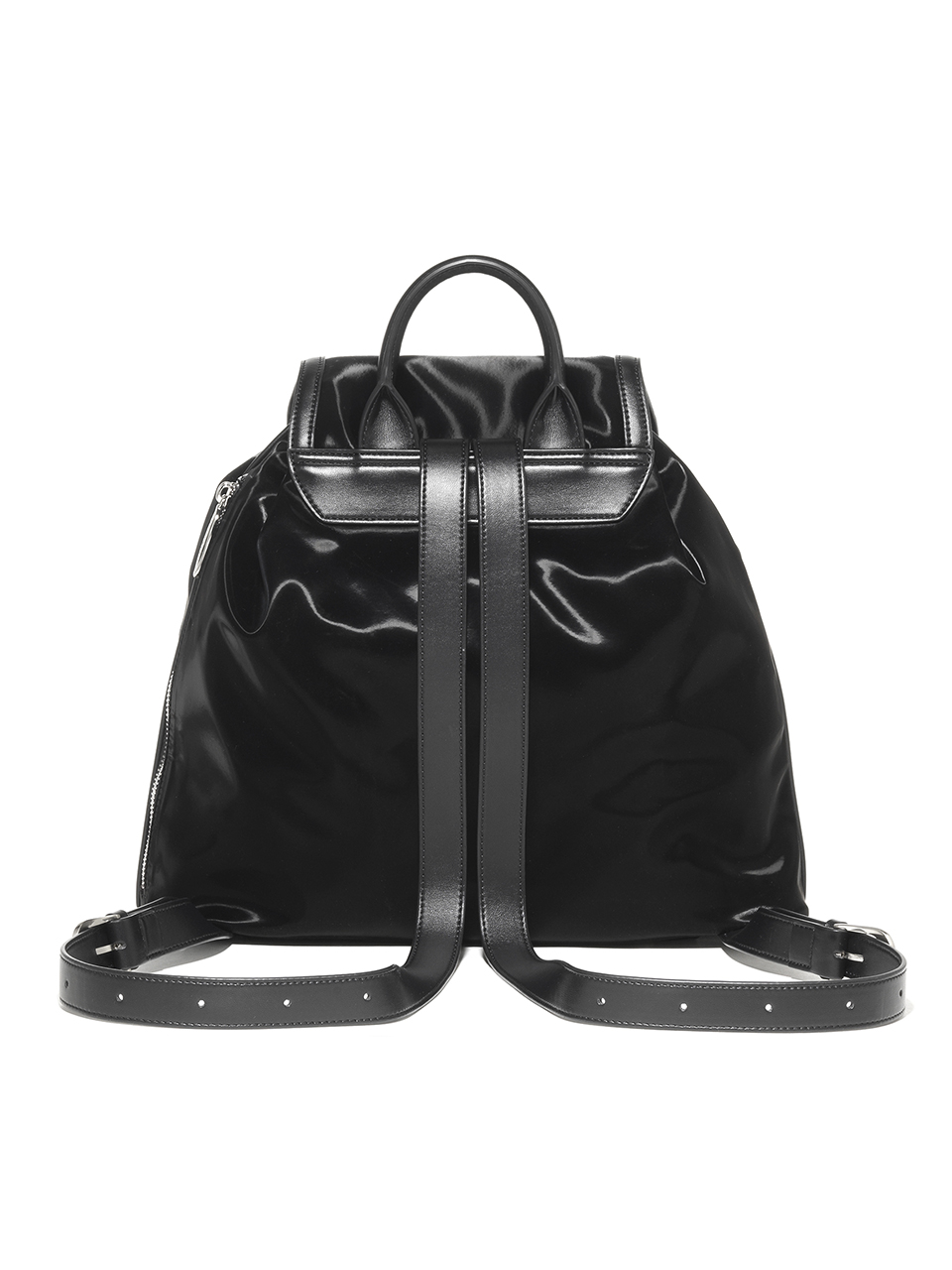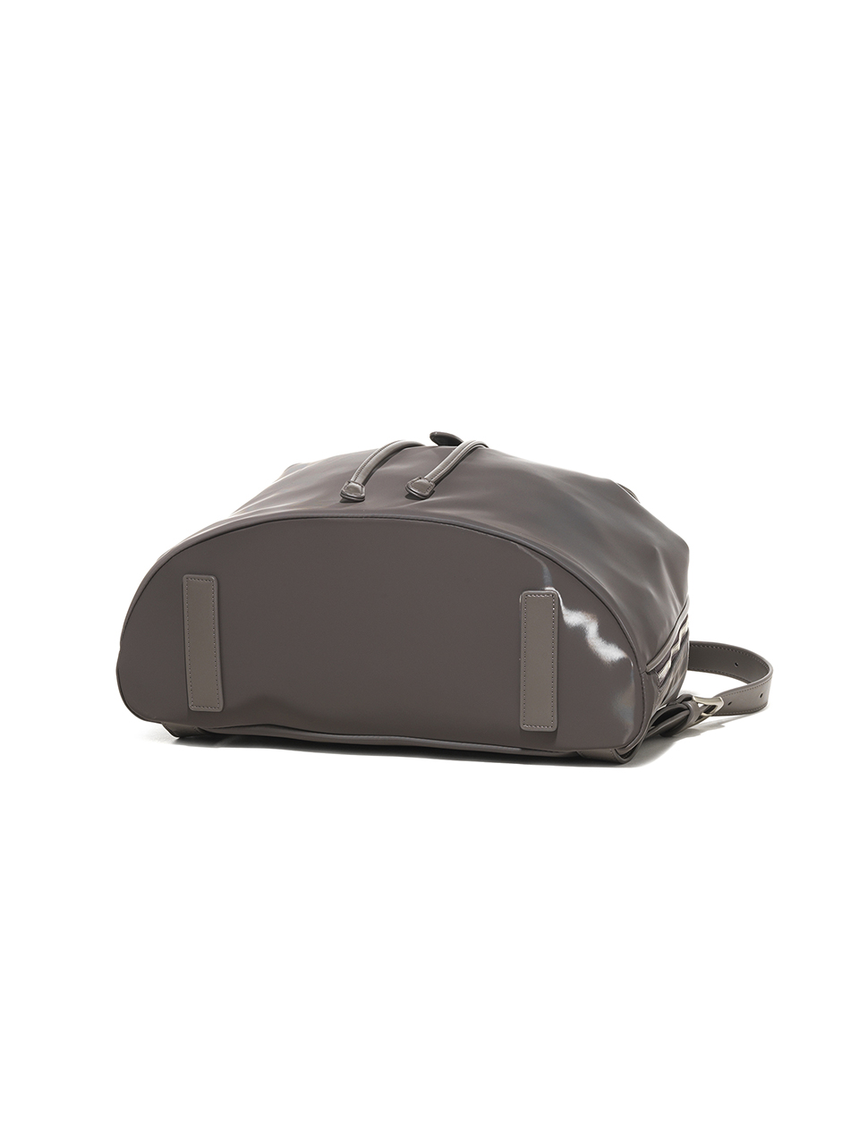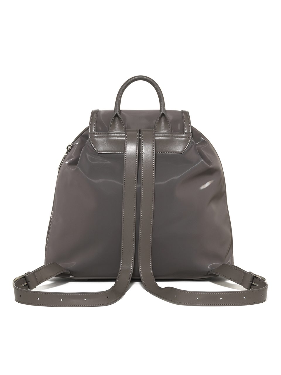 · A sleek backpack defined by its subtle glossy finish and clean leather trim, creating a polished and modern silhouette