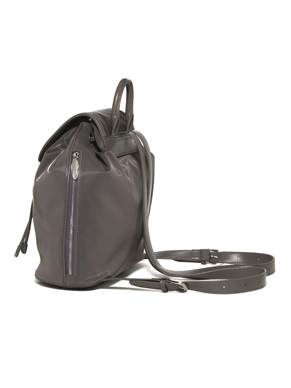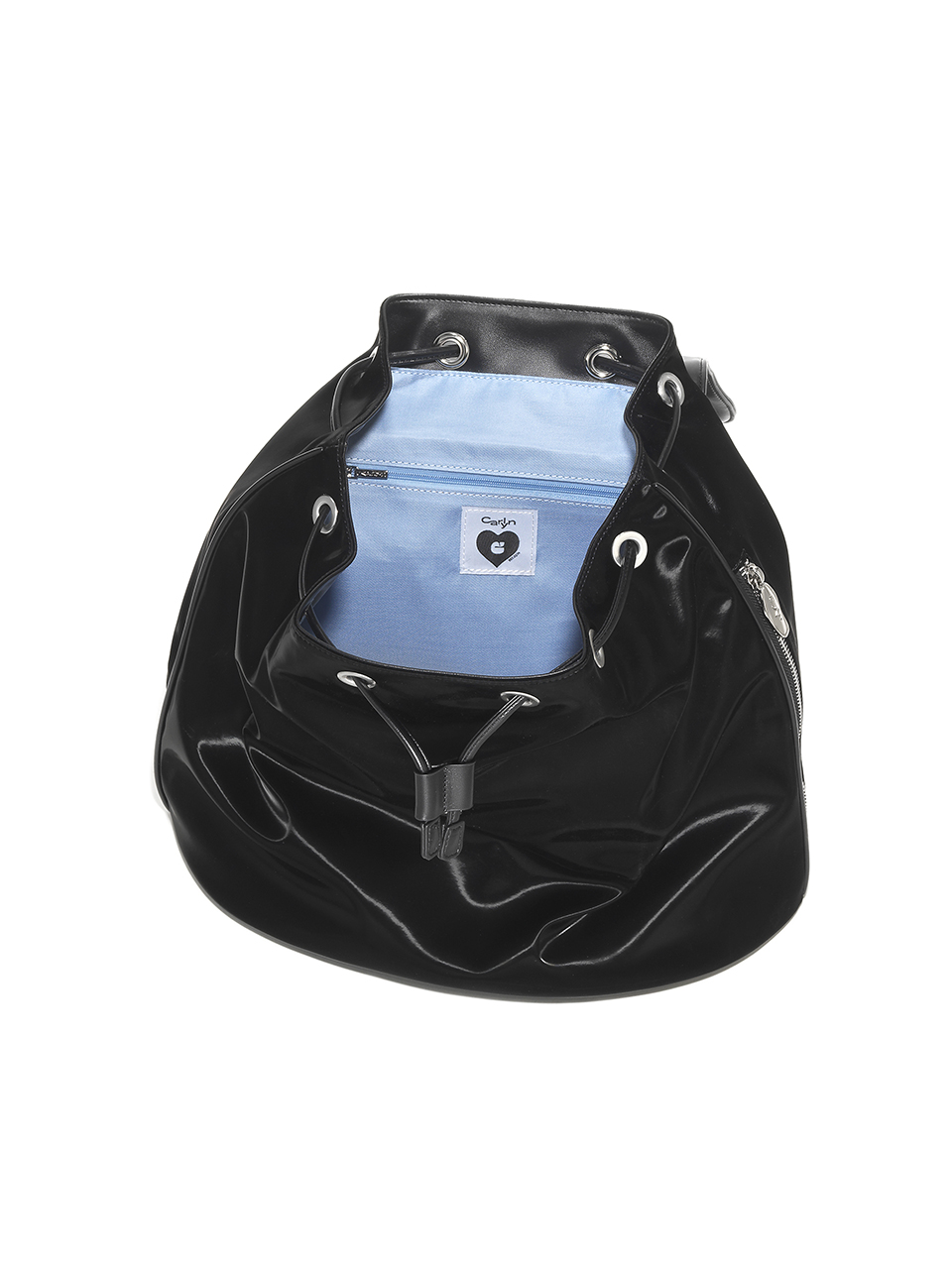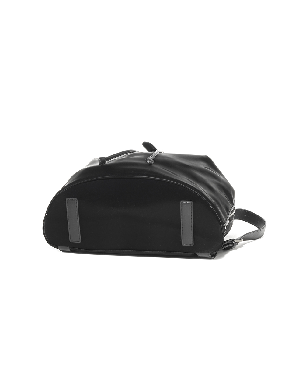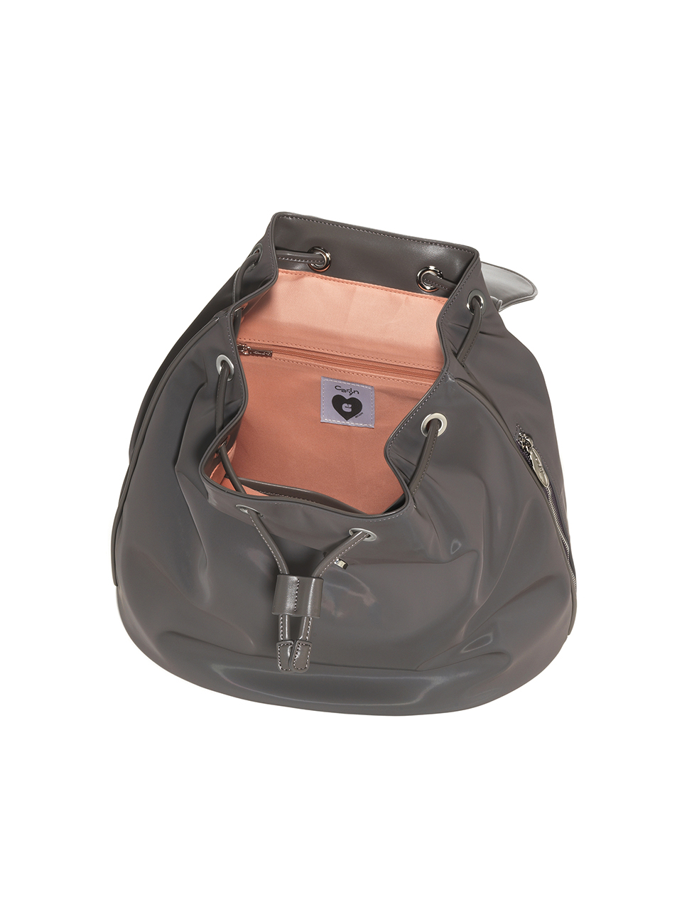 · A sleek backpack defined by its subtle glossy finish and clean leather trim, creating a polished and modern silhouette