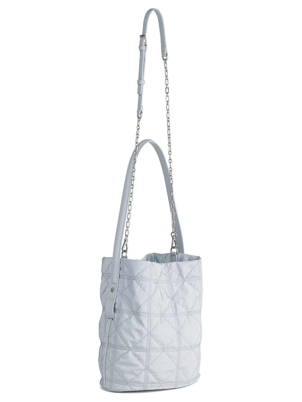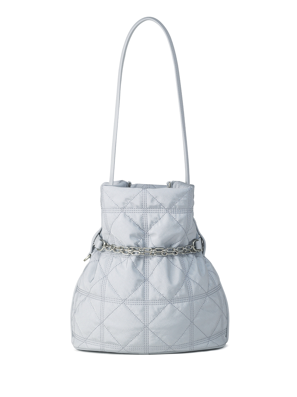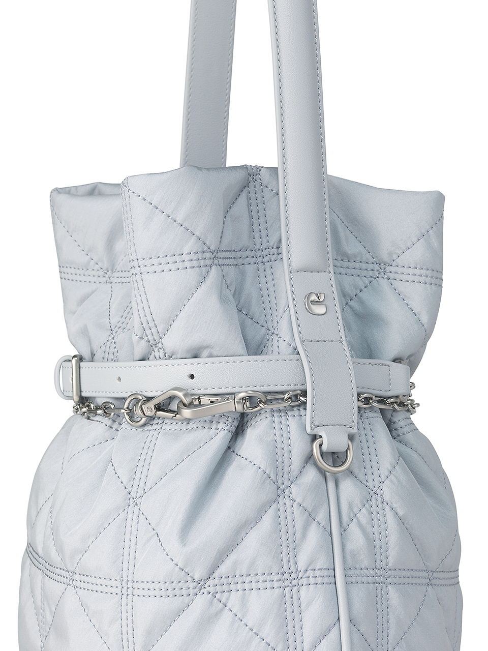 · Shirred silhouette created by a voluminous body and chain strap